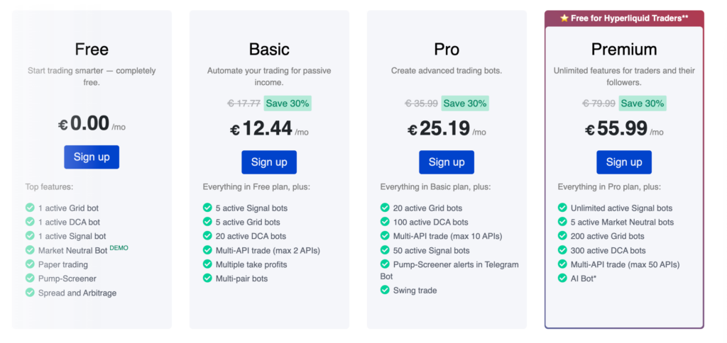 Pro Plan (~$44.95/month) — Unlimited bots, unlimited copy trading strategies, priority support, and API access.